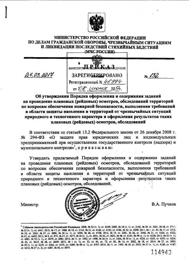 Приказ Министерства Российской Федерации по делам гражданской обороны, чрезвычайным ситуациям и ликвидации последствий стихийных бедствий от 24.03.2017 № 132