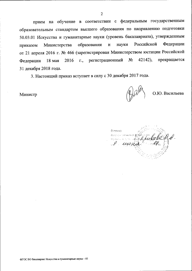 "Об утверждении федерального государственного образовательного стандарта высшего образования — бакалавриат по направлению подготовки 50.03.01 Искусства и гуманитарные науки"