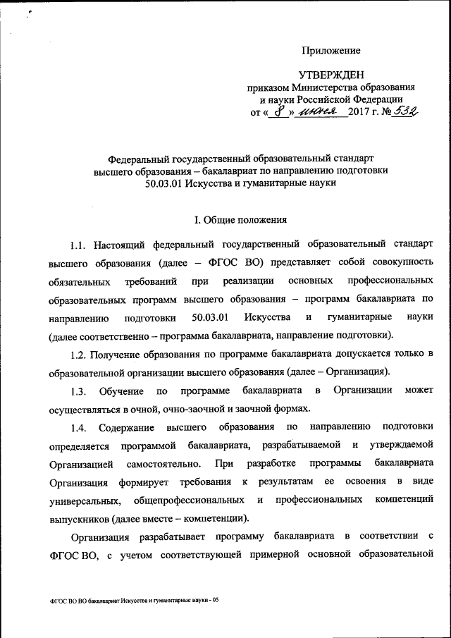 "Об утверждении федерального государственного образовательного стандарта высшего образования — бакалавриат по направлению подготовки 50.03.01 Искусства и гуманитарные науки"