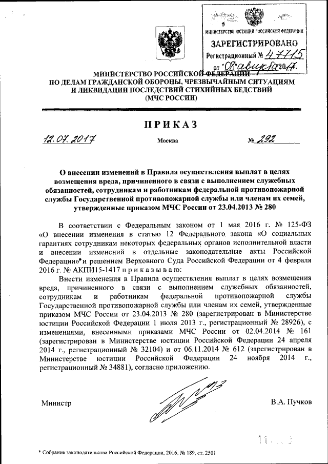 Приказ Министерства Российской Федерации по делам гражданской обороны, чрезвычайным ситуациям и ликвидации последствий стихийных бедствий от 12.07.2017 № 292