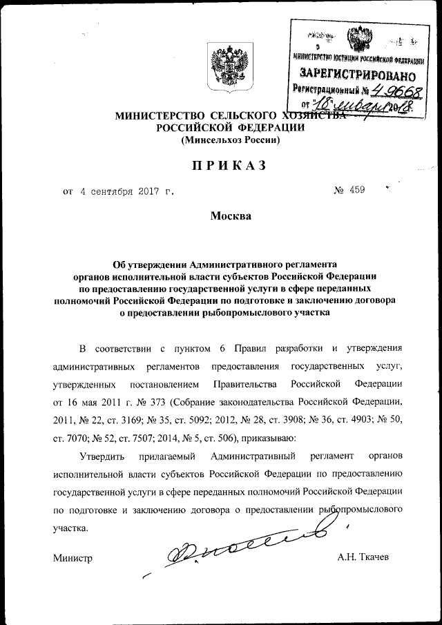 Приказ Министерства сельского хозяйства Российской Федерации от 04.09.2017 № 459