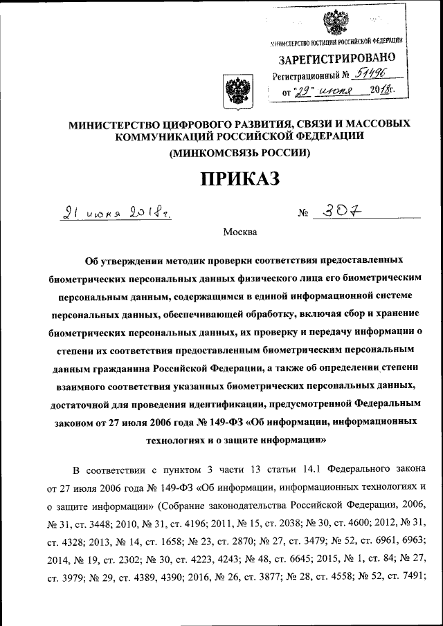 Приказ Министерства цифрового развития, связи и массовых коммуникаций Российской Федерации от 21.06.2018 № 307