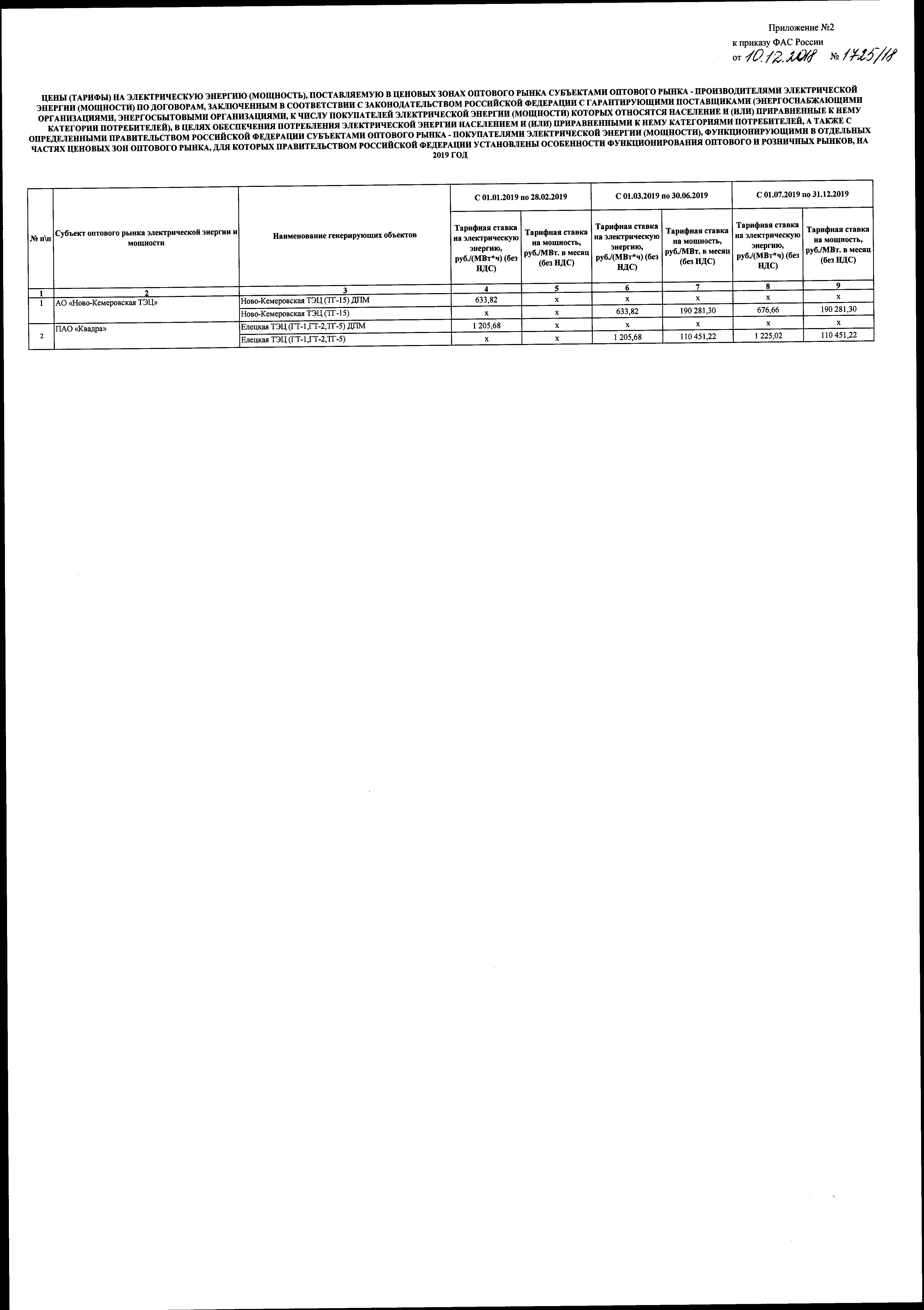 "Об утверждении цен (тарифов) на электрическую энергию (мощность), поставляемую в ценовых зонах оптового рынка субъектами оптового рынка-производителями электрической энергии (мощности) по договорам, заключенным в соответствии с законодательством Российской Федерации с гарантирующими поставщиками (энергоснабжающими организациями, энергосбытовыми организациями, к числу покупателей электрической энергии (мощности) которых относятся население и (или) приравненные к нему категории потребителей), в целях обеспечения потребления электрической энергии населением и (или) приравненными к нему категориями потребителей, а также с определенными Правительством Российской Федерации субъектами оптового рынка-покупателями электрической энергии (мощности), функционирующими в отдельных частях ценовых зон оптового рынка, для которых Правительством Российской Федерации установлены особенности функционирования оптового и розничных рынков, на 2019 год"