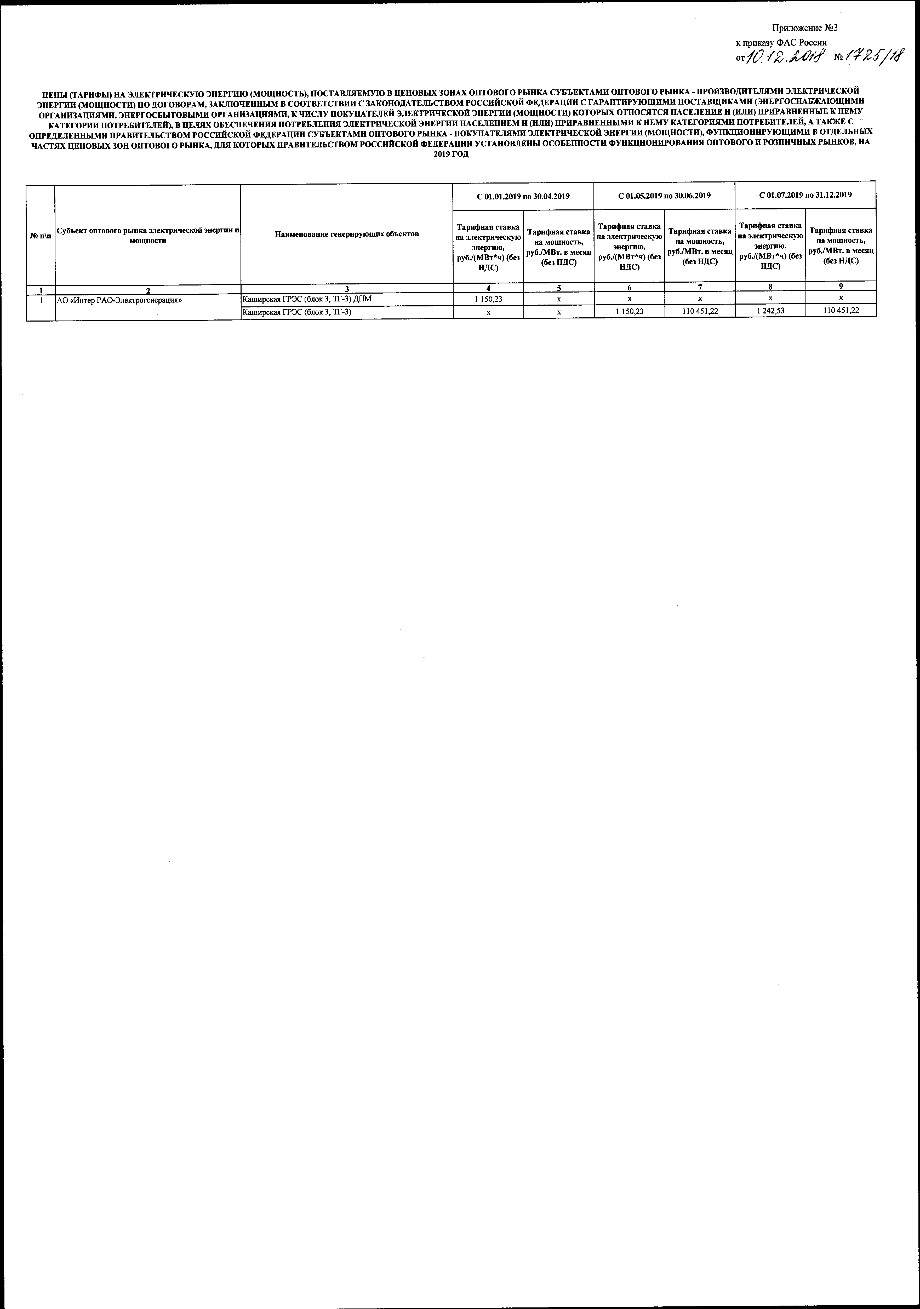 "Об утверждении цен (тарифов) на электрическую энергию (мощность), поставляемую в ценовых зонах оптового рынка субъектами оптового рынка-производителями электрической энергии (мощности) по договорам, заключенным в соответствии с законодательством Российской Федерации с гарантирующими поставщиками (энергоснабжающими организациями, энергосбытовыми организациями, к числу покупателей электрической энергии (мощности) которых относятся население и (или) приравненные к нему категории потребителей), в целях обеспечения потребления электрической энергии населением и (или) приравненными к нему категориями потребителей, а также с определенными Правительством Российской Федерации субъектами оптового рынка-покупателями электрической энергии (мощности), функционирующими в отдельных частях ценовых зон оптового рынка, для которых Правительством Российской Федерации установлены особенности функционирования оптового и розничных рынков, на 2019 год"