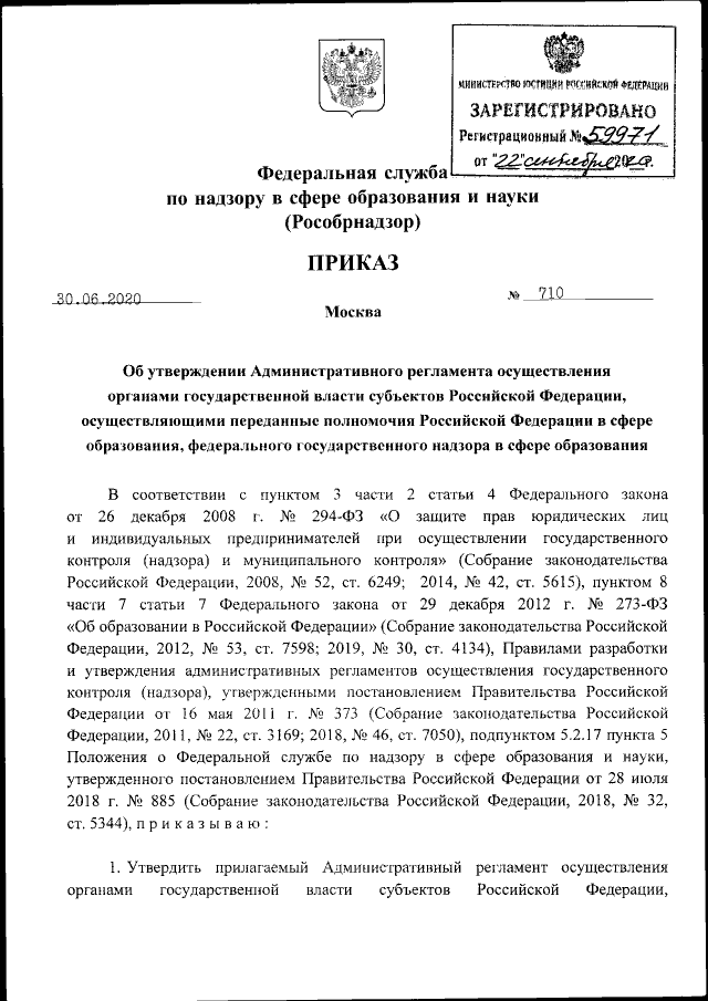 Приказ Федеральной службы по надзору в сфере образования и науки от 30.06.2020 № 710