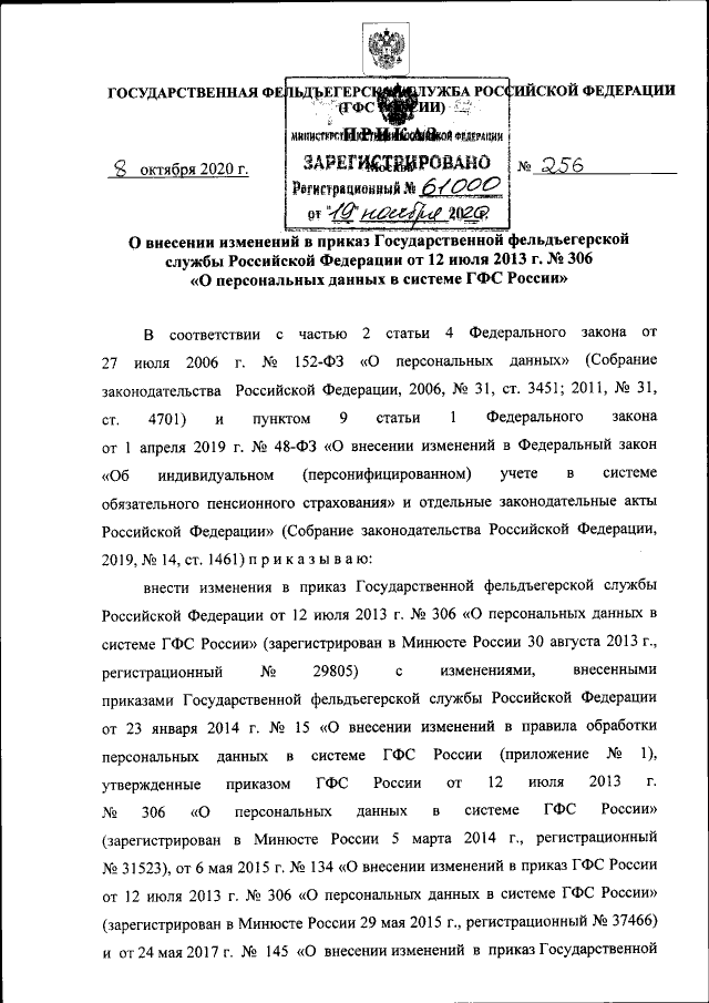 "О внесении изменений в приказ Государственной фельдъегерской службы Российской Федерации от 12 июля 2013 г. № 306 "О персональных данных в системе ГФС России"