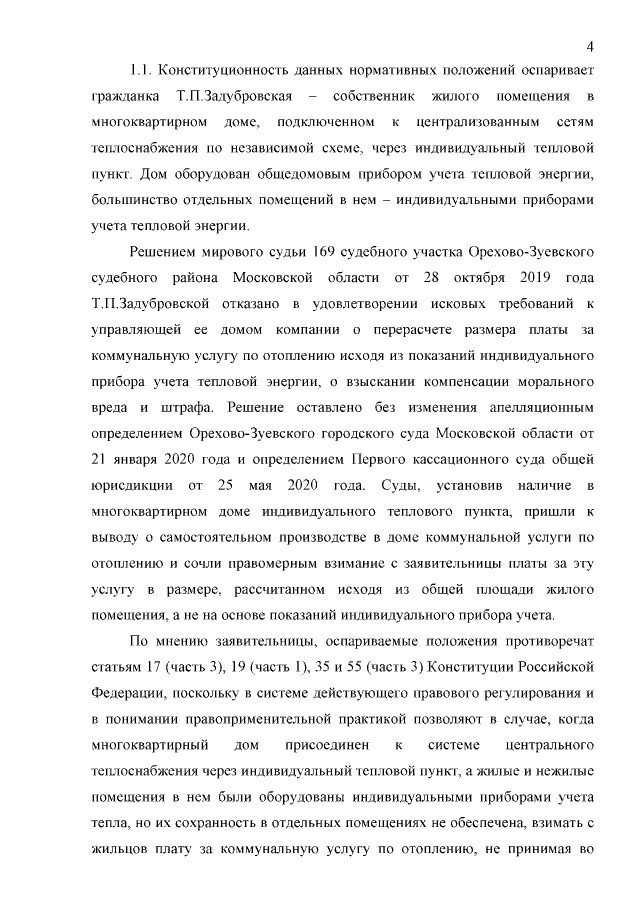 по делу о проверке конституционности частей 1 и 1-1 статьи 157 Жилищного кодекса Российской Федерации, абзаца третьего пункта 40, абзацев первого и четвертого пункта 54 Правил предоставления коммунальных услуг собственникам и пользователям помещений в многоквартирных домах и жилых домов в связи с жалобой гражданки Т.П.Задубровской