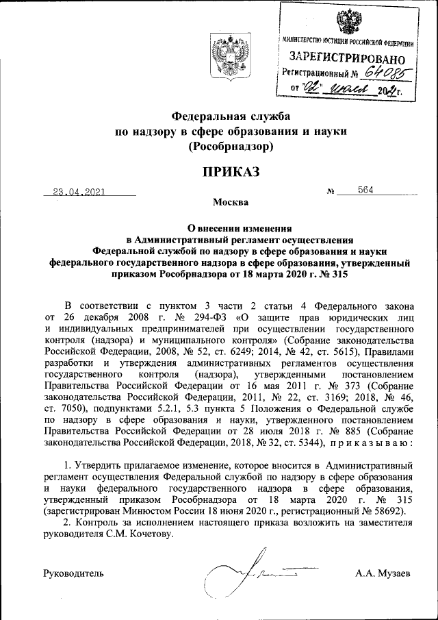 Приказ Федеральной службы по надзору в сфере образования и науки от 23.04.2021 № 564
