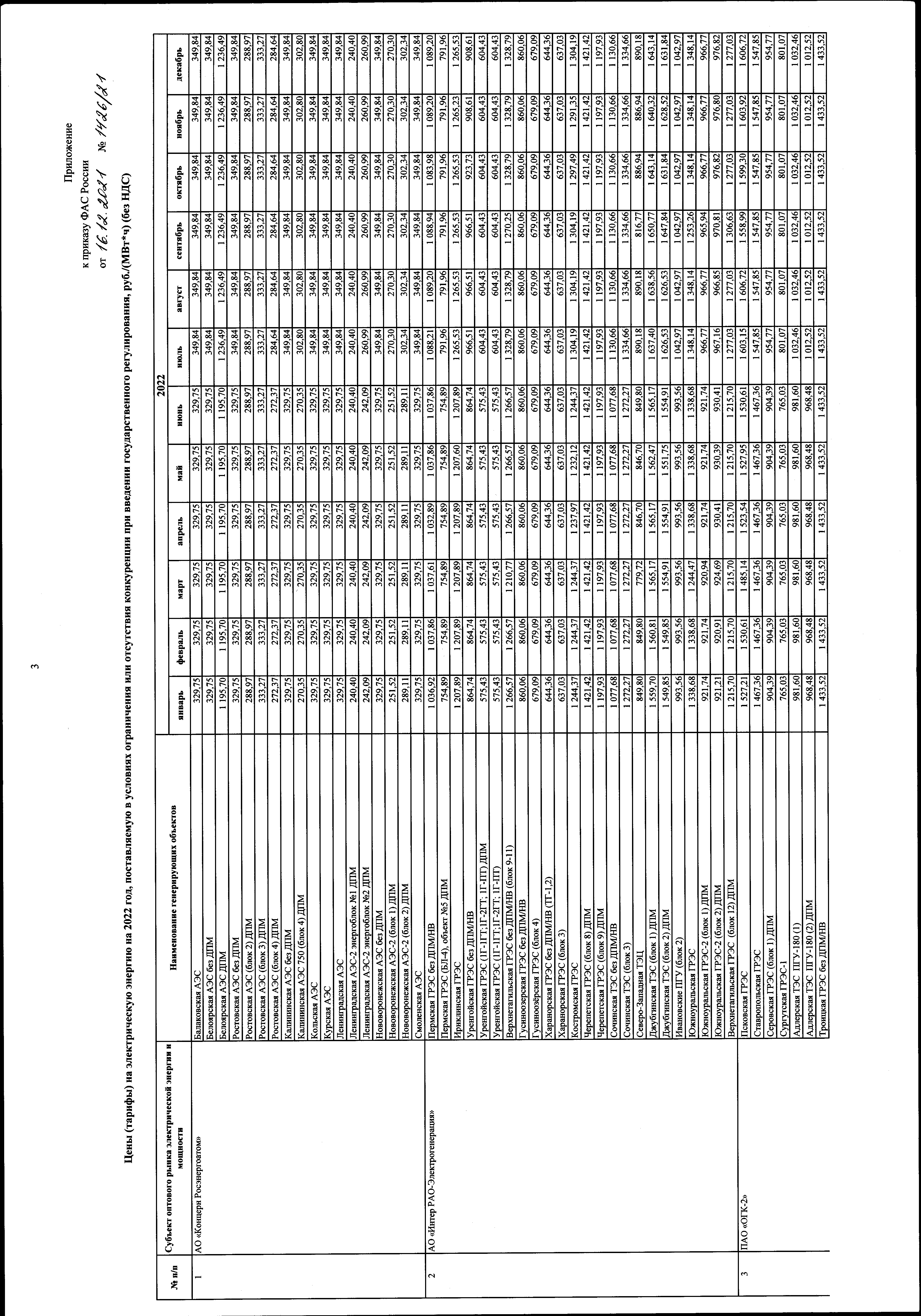 "Об утверждении цен (тарифов) на электрическую энергию на 2022 год, поставляемую в условиях ограничения или отсутствия конкуренции при введении государственного регулирования"