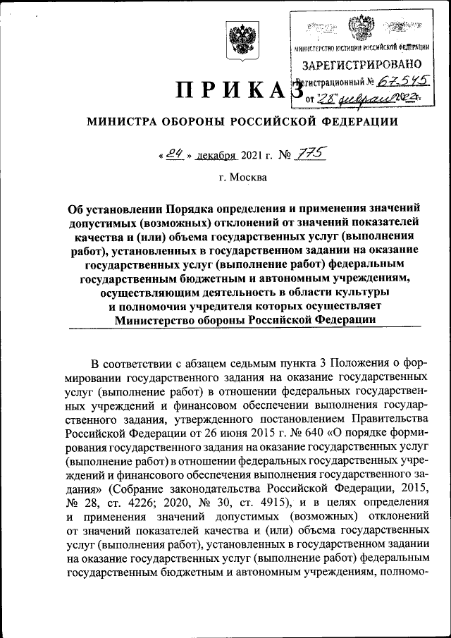 Приказ Министра обороны Российской Федерации от 24.12.2021 № 775