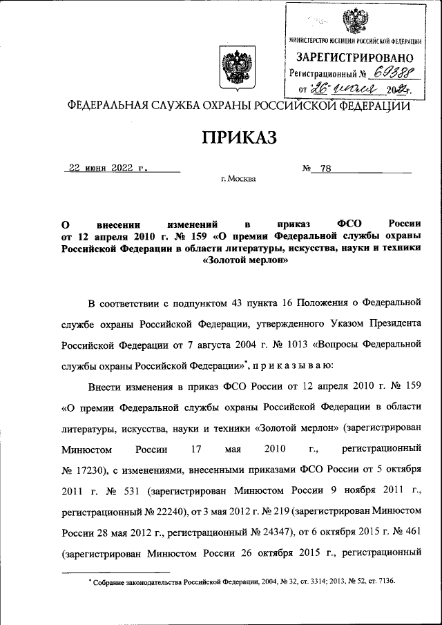 "О внесении изменений в приказ ФСО России от 12 апреля 2010 г. № 159 "О премии Федеральной службы охраны Российской Федерации в области литературы, искусства, науки и техники "Золотой мерлон"