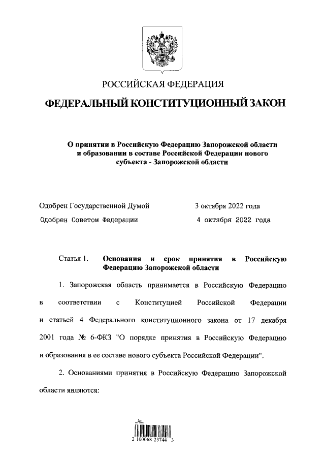 "О принятии в Российскую Федерацию Запорожской области и образовании в составе Российской Федерации нового субъекта - Запорожской области"