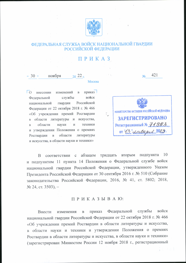 "О внесении изменений в приказ Федеральной службы войск национальной гвардии Российской Федерации от 22 октября 2018 г. № 466 "Об учреждении премий Росгвардии в области литературы и искусства, в области науки и техники и утверждении Положения о премиях Росгвардии в области литературы и искусства, в области науки и техники"