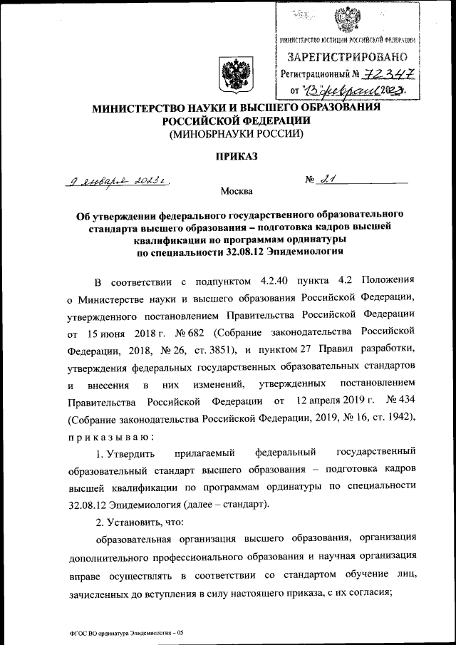 Приказ Министерства науки и высшего образования Российской Федерации от 09.01.2023 № 21