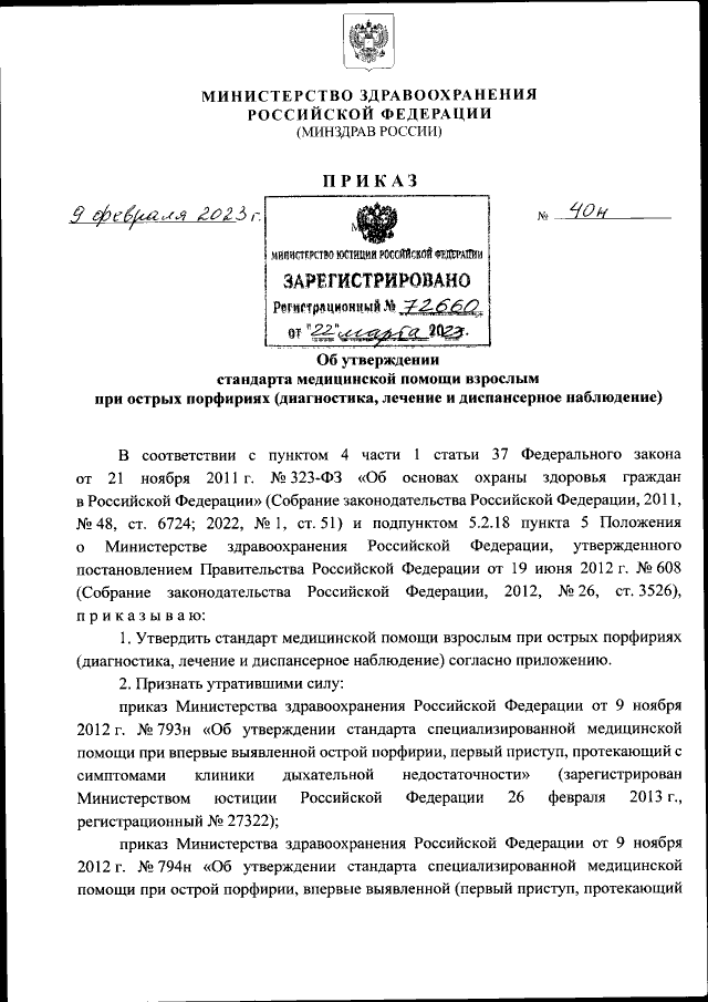 Приказ Министерства здравоохранения Российской Федерации от 09.02.2023 № 40н