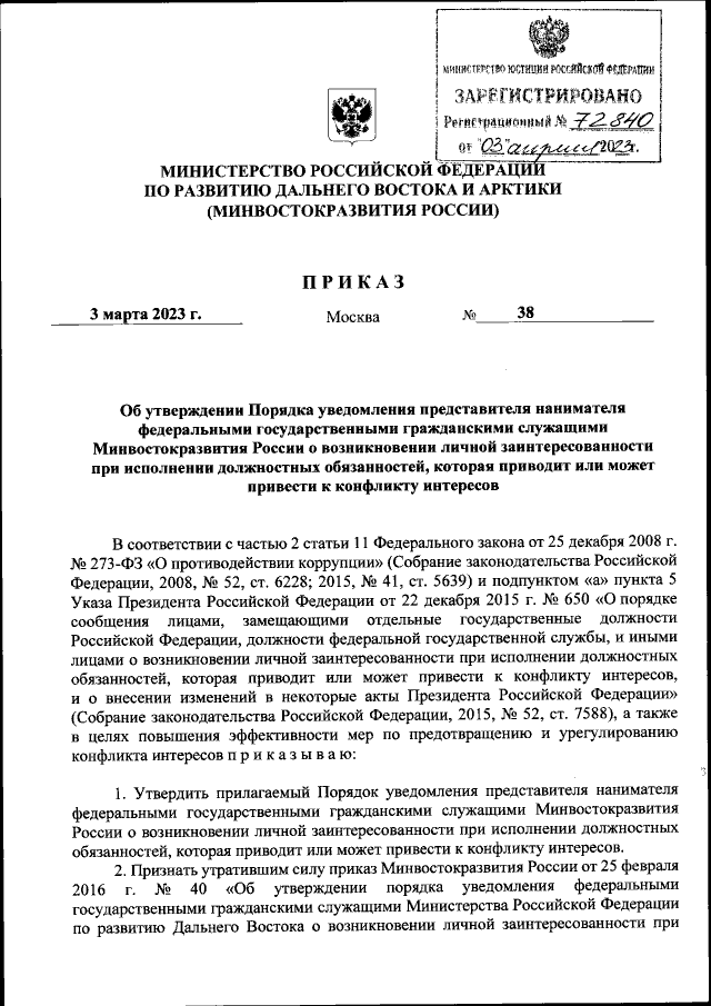 Приказ Министерства Российской Федерации по развитию Дальнего Востока и Арктики от 03.03.2023 № 38