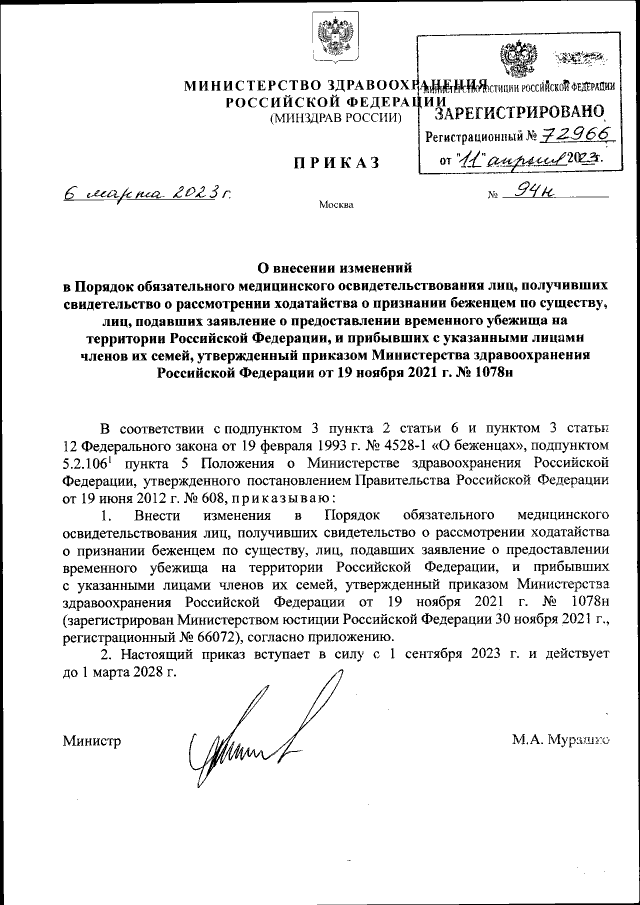 Приказ Министерства здравоохранения Российской Федерации от 06.03.2023 № 94н