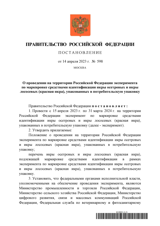 "О проведении на территории Российской Федерации эксперимента по маркировке средствами идентификации икры осетровых и икры лососевых (красная икра), упакованных в потребительскую упаковку"
