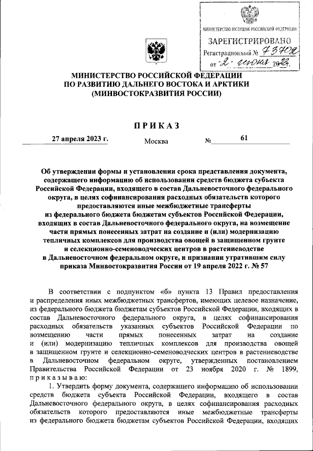 Приказ Министерства Российской Федерации по развитию Дальнего Востока и Арктики от 27.04.2023 № 61