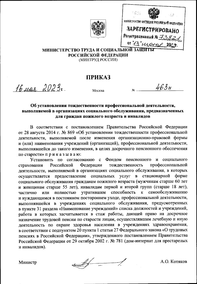 Приказ Министерства труда и социальной защиты Российской Федерации от 16.05.2023 № 463н