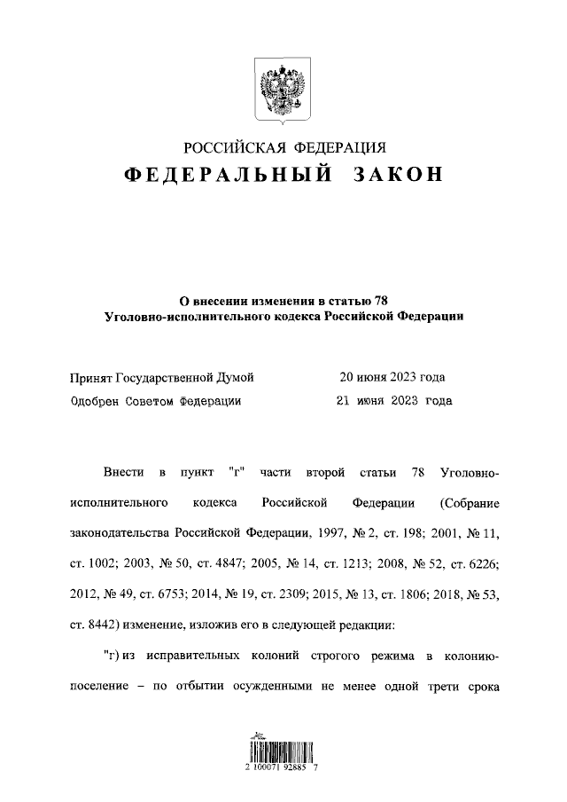 "О внесении изменения в статью 78 Уголовно-исполнительного кодекса Российской Федерации"