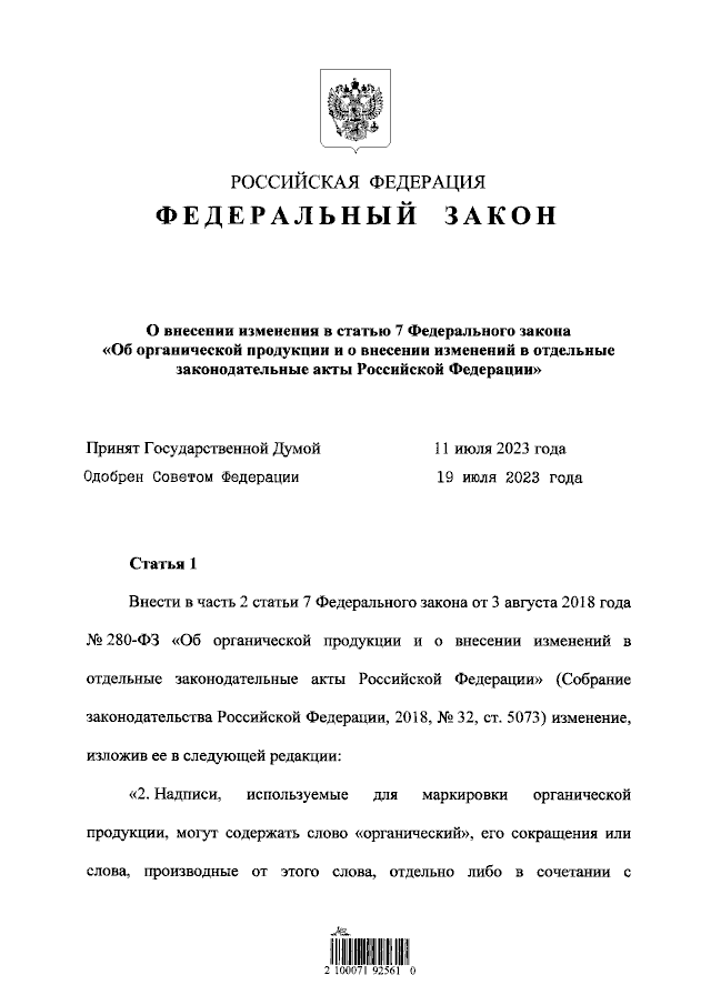 "О внесении изменения в статью 7 Федерального закона "Об органической продукции и о внесении изменений в отдельные законодательные акты Российской Федерации"