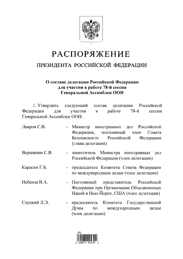 "О составе делегации Российской Федерации для участия в работе 78-й сессии Генеральной Ассамблеи ООН"