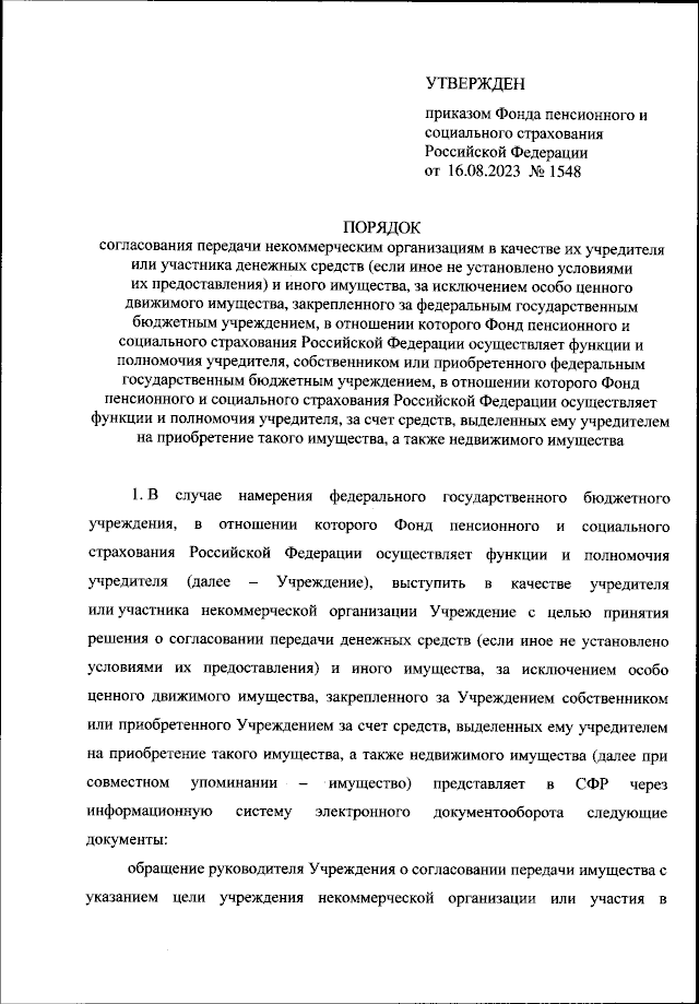 "Об утверждении Порядка согласования передачи некоммерческим организациям в качестве их учредителя или участника денежных средств (если иное не установлено условиями их предоставления) и иного имущества, за исключением особо ценного движимого имущества, закрепленного за федеральным государственным бюджетным учреждением, в отношении которого Фонд пенсионного и социального страхования Российской Федерации осуществляет функции и полномочия учредителя, собственником или приобретенного федеральным государственным бюджетным учреждением, в отношении которого Фонд пенсионного и социального страхования Российской Федерации осуществляет функции и полномочия учредителя, за счет средств, выделенных ему учредителем на приобретение такого имущества, а также недвижимого имущества"