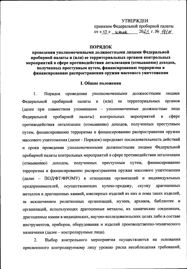 Приказ Федеральной пробирной палаты от 10.07.2023 № 141н
