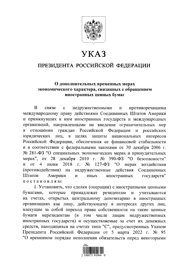 "О дополнительных временных мерах экономического характера, связанных с обращением иностранных ценных бумаг"