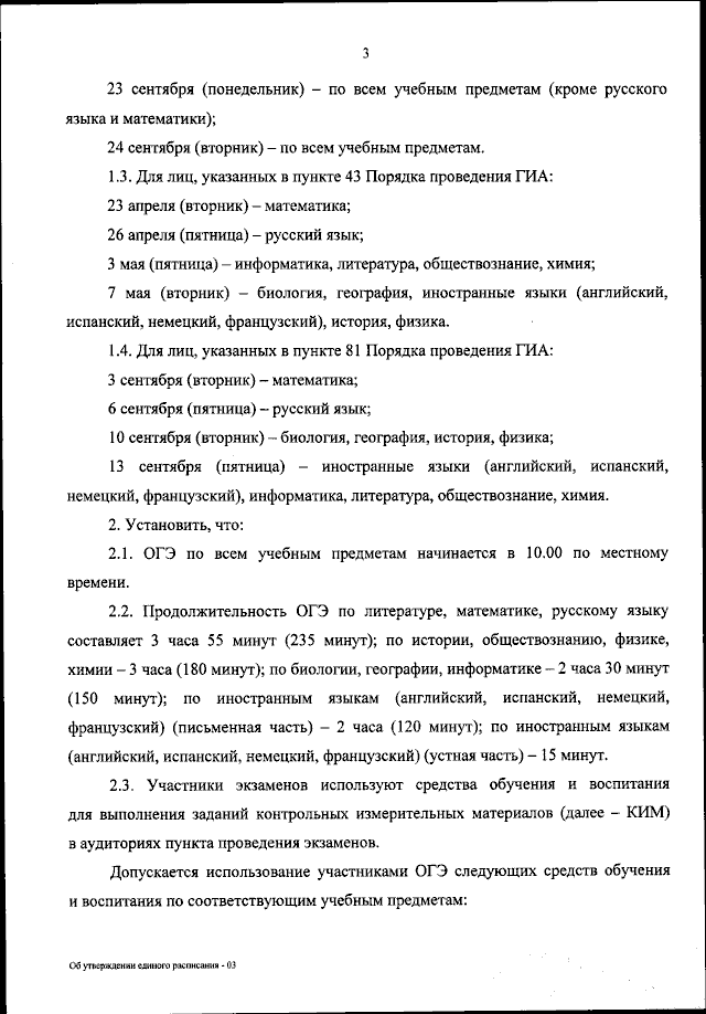 "Об утверждении единого расписания и продолжительности проведения основного государственного экзамена по каждому учебному предмету, требований к использованию средств обучения и воспитания при его проведении в 2024 году"
