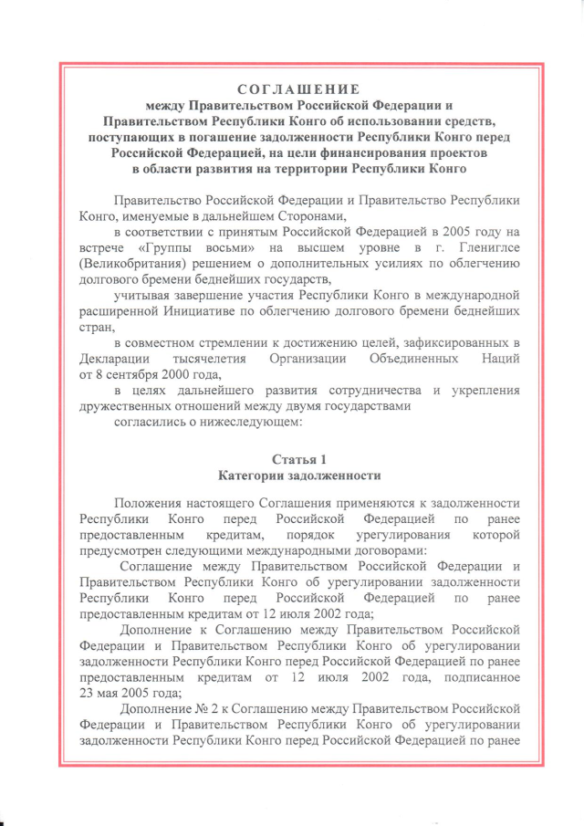 Соглашение между Правительством Российской Федерации и Правительством Республики Конго об использовании средств, поступающих в погашение задолженности Республики Конго перед Российской Федерацией, на цели финансирования проектов в области развития на территории Республики Конго от 22 декабря 2023 г.