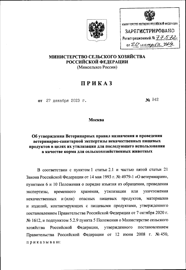 Приказ Министерства сельского хозяйства Российской Федерации от 27.12.2023 № 942