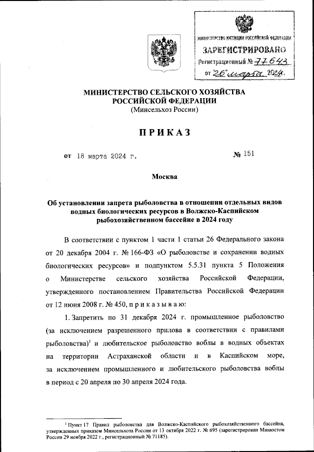 "Об установлении запрета рыболовства в отношении отдельных видов водных биологических ресурсов в Волжско-Каспийском рыбохозяйственном бассейне в 2024 году"