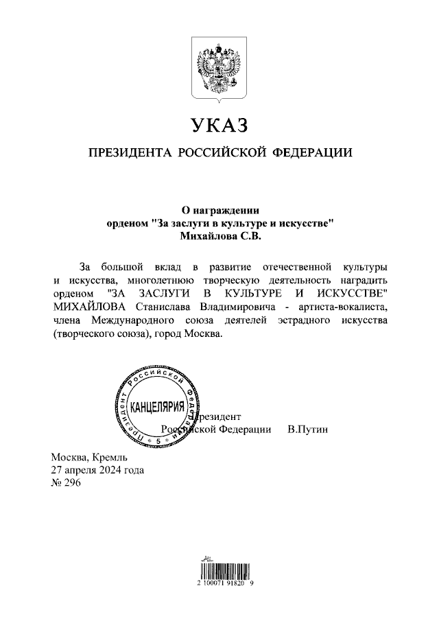 Указ Президента Российской Федерации от 27.04.2024 № 296