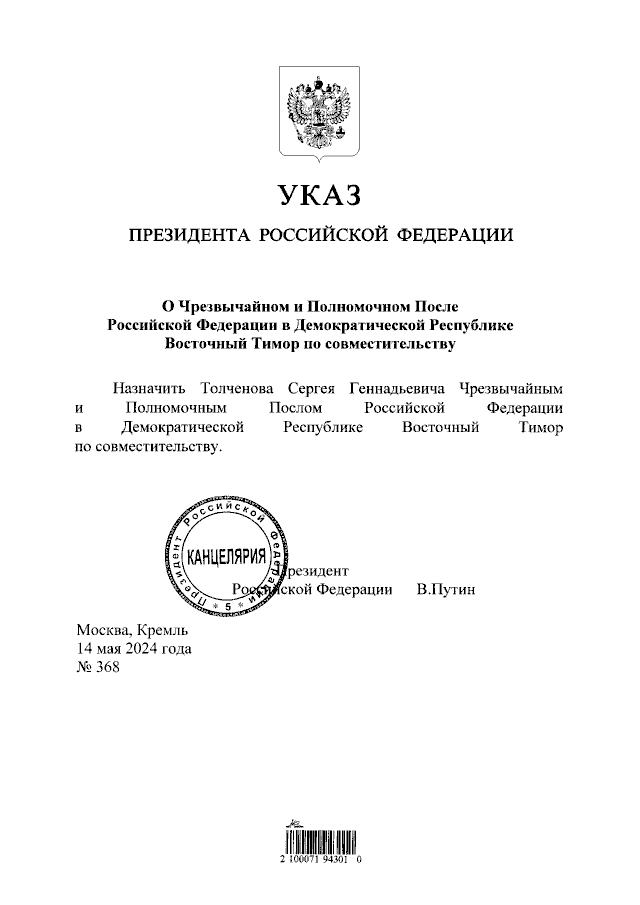 Указ Президента Российской Федерации от 14.05.2024 № 368