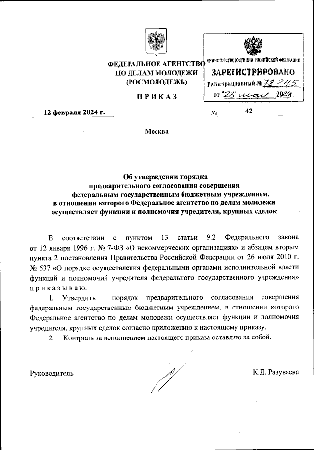 Приказ Федерального агентства по делам молодежи от 12.02.2024 № 42