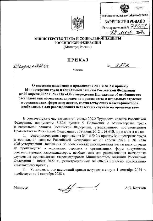 "О внесении изменений в приложения № 1 и № 2 к приказу Министерства труда и социальной защиты Российской Федерации от 20 апреля 2022 г. № 223н "Об утверждении Положения об особенностях расследования несчастных случаев на производстве в отдельных отраслях и организациях, форм документов, соответствующих классификаторов, необходимых для расследования несчастных случаев на производстве"