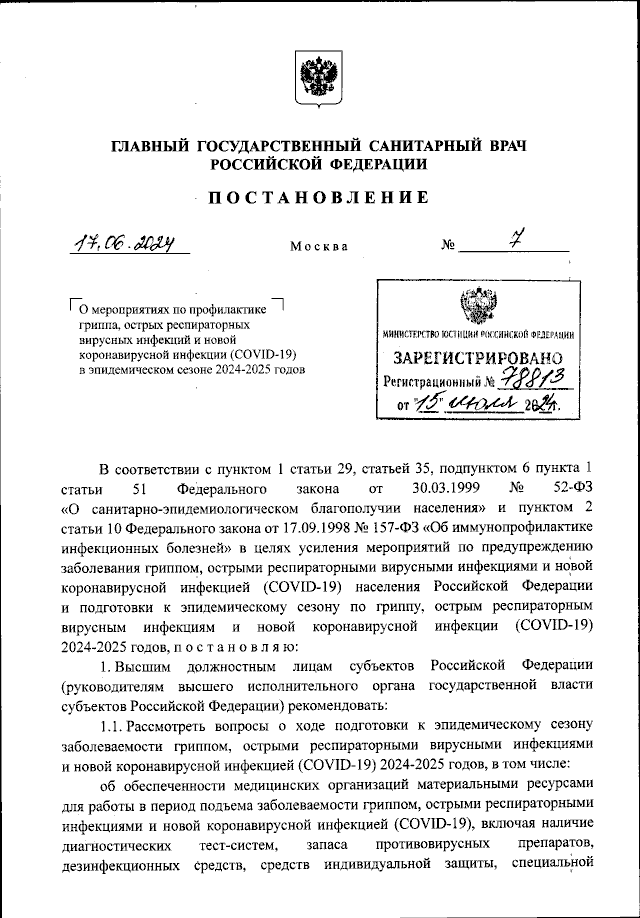 Постановление Главного государственного санитарного врача Российской Федерации от 17.06.2024 № 7