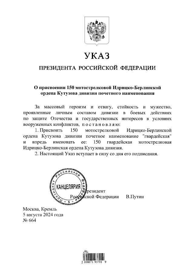 Указ Президента Российской Федерации от 05.08.2024 № 664