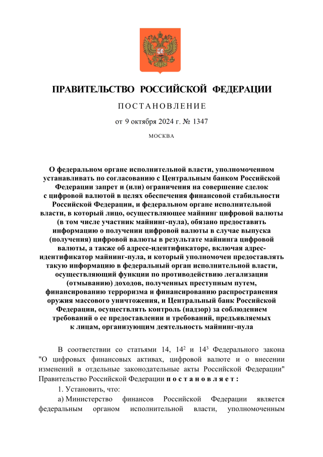 "О федеральном органе исполнительной власти, уполномоченном устанавливать по согласованию с Центральным банком Российской Федерации запрет и (или) ограничения на совершение сделок с цифровой валютой в целях обеспечения финансовой стабильности Российской Федерации, и федеральном органе исполнительной власти, в который лицо, осуществляющее майнинг цифровой валюты (в том числе участник майнинг-пула), обязано предоставить информацию о получении цифровой валюты в случае выпуска (получения) цифровой валюты в результате майнинга цифровой валюты, а также об адресе-идентификаторе, включая адрес-идентификатор майнинг-пула, и который уполномочен предоставлять такую информацию в федеральный орган исполнительной власти, осуществляющий функции по противодействию легализации (отмыванию) доходов, полученных преступным путем, финансированию терроризма и финансированию распространения оружия массового уничтожения, и Центральный банк Российской Федерации, осуществлять контроль (надзор) за соблюдением требований о ее предоставлении и требований, предъявляемых к лицам, организующим деятельность майнинг-пула"