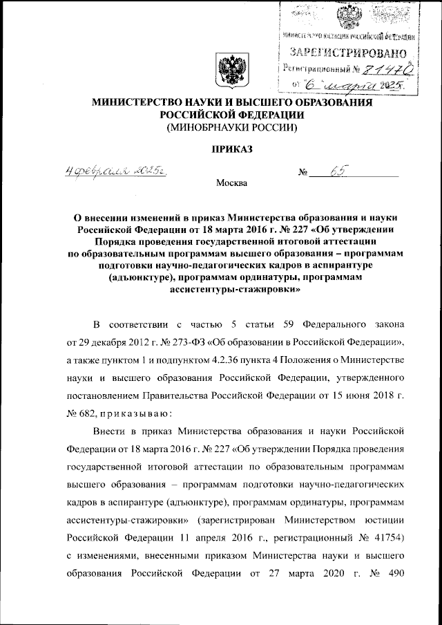 Приказ Министерства науки и высшего образования Российской Федерации от 04.02.2025 № 65