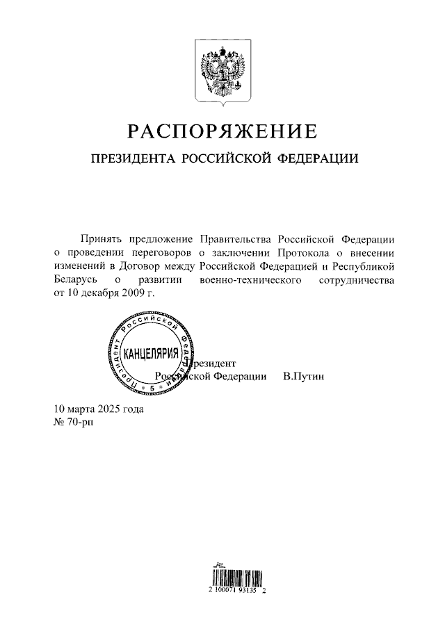 Распоряжение Президента Российской Федерации от 10.03.2025 № 70-рп