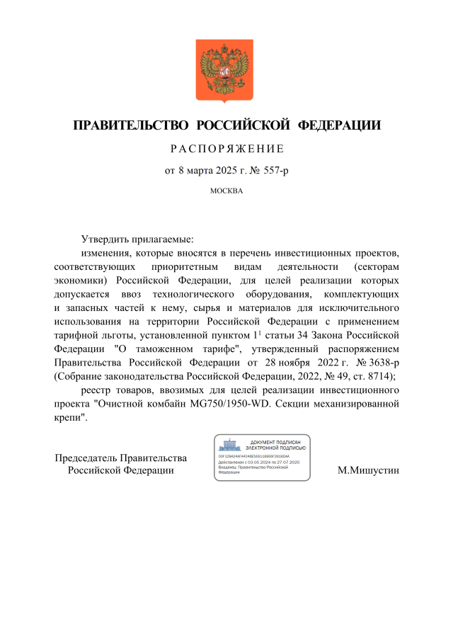 Распоряжение Правительства Российской Федерации от 08.03.2025 № 557-р