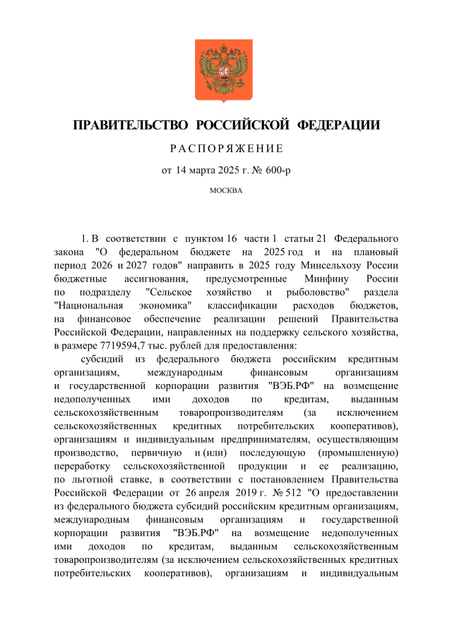 Распоряжение Правительства Российской Федерации от 14.03.2025 № 600-р