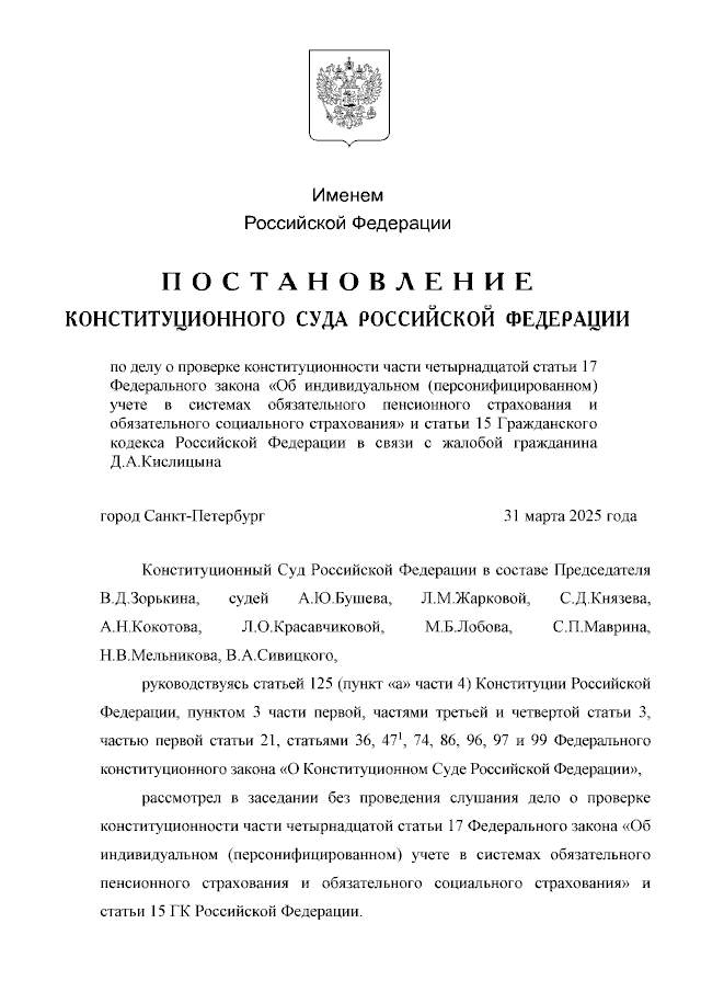 по делу о проверке конституционности части четырнадцатой статьи 17 Федерального закона "Об индивидуальном (персонифицированном) учете в системах обязательного пенсионного страхования и обязательного социального страхования" и статьи 15 Гражданского кодекса Российской Федерации в связи с жалобой гражданина Д.А.Кислицына