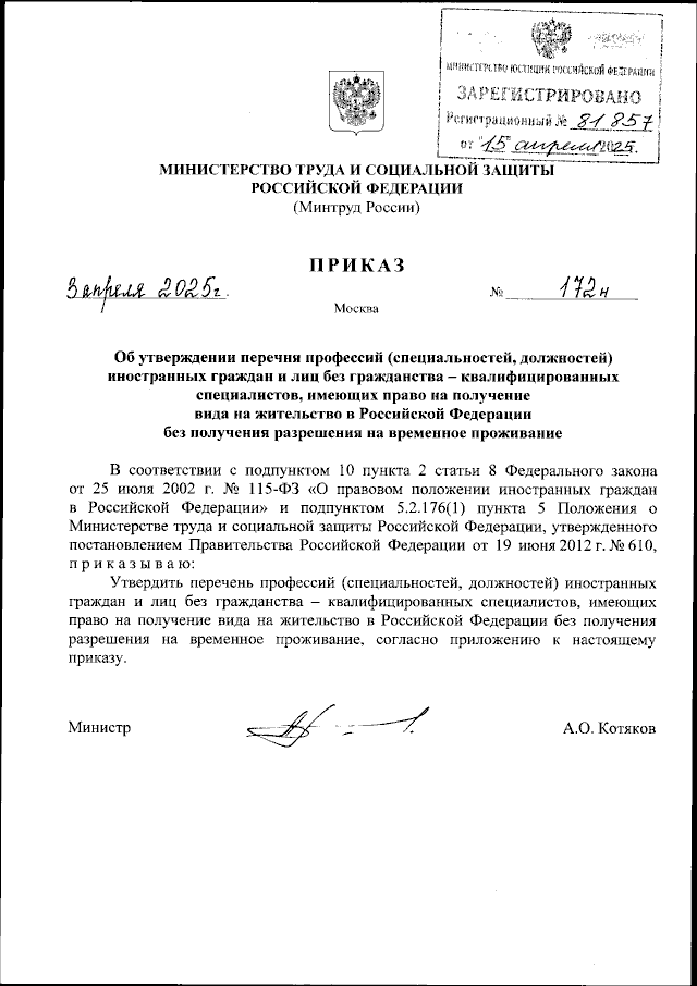 Приказ Министерства труда и социальной защиты Российской Федерации от 03.04.2025 № 172н