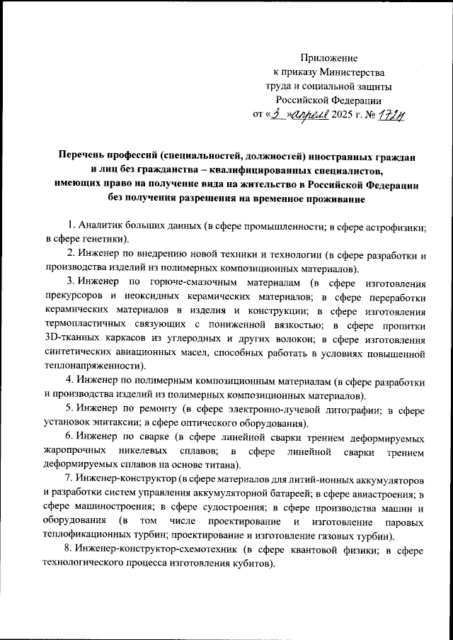 "Об утверждении перечня профессий (специальностей, должностей) иностранных граждан и лиц без гражданства - квалифицированных специалистов, имеющих право на получение вида на жительство в Российской Федерации без получения разрешения на временное проживание"