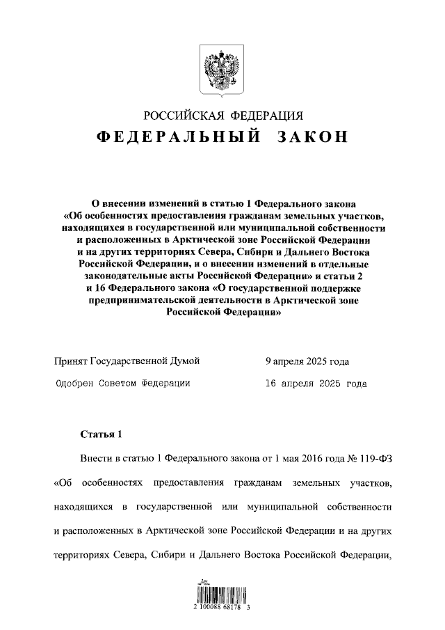 "О внесении изменений в статью 1 Федерального закона "Об особенностях предоставления гражданам земельных участков, находящихся в государственной или муниципальной собственности и расположенных в Арктической зоне Российской Федерации и на других территориях Севера, Сибири и Дальнего Востока Российской Федерации, и о внесении изменений в отдельные законодательные акты Российской Федерации" и статьи 2 и 16 Федерального закона "О государственной поддержке предпринимательской деятельности в Арктической зоне Российской Федерации"