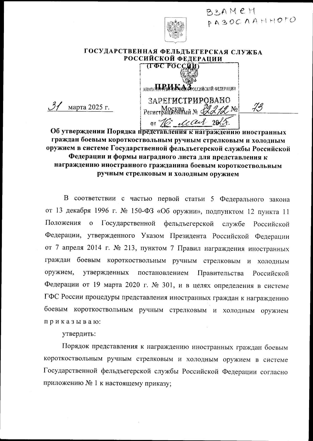 Приказ Государственной фельдъегерской службы Российской Федерации от 31.03.2025 № 73